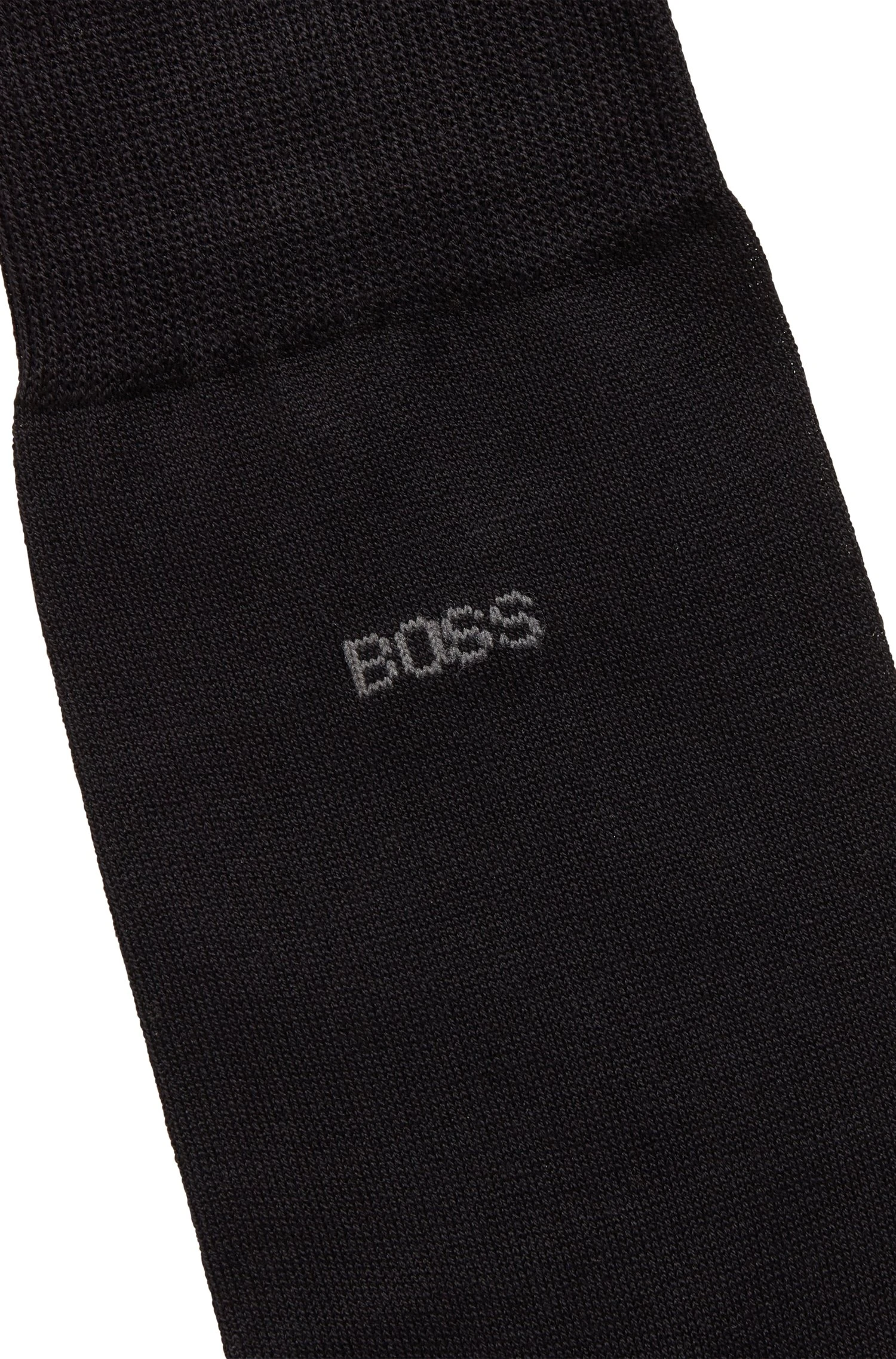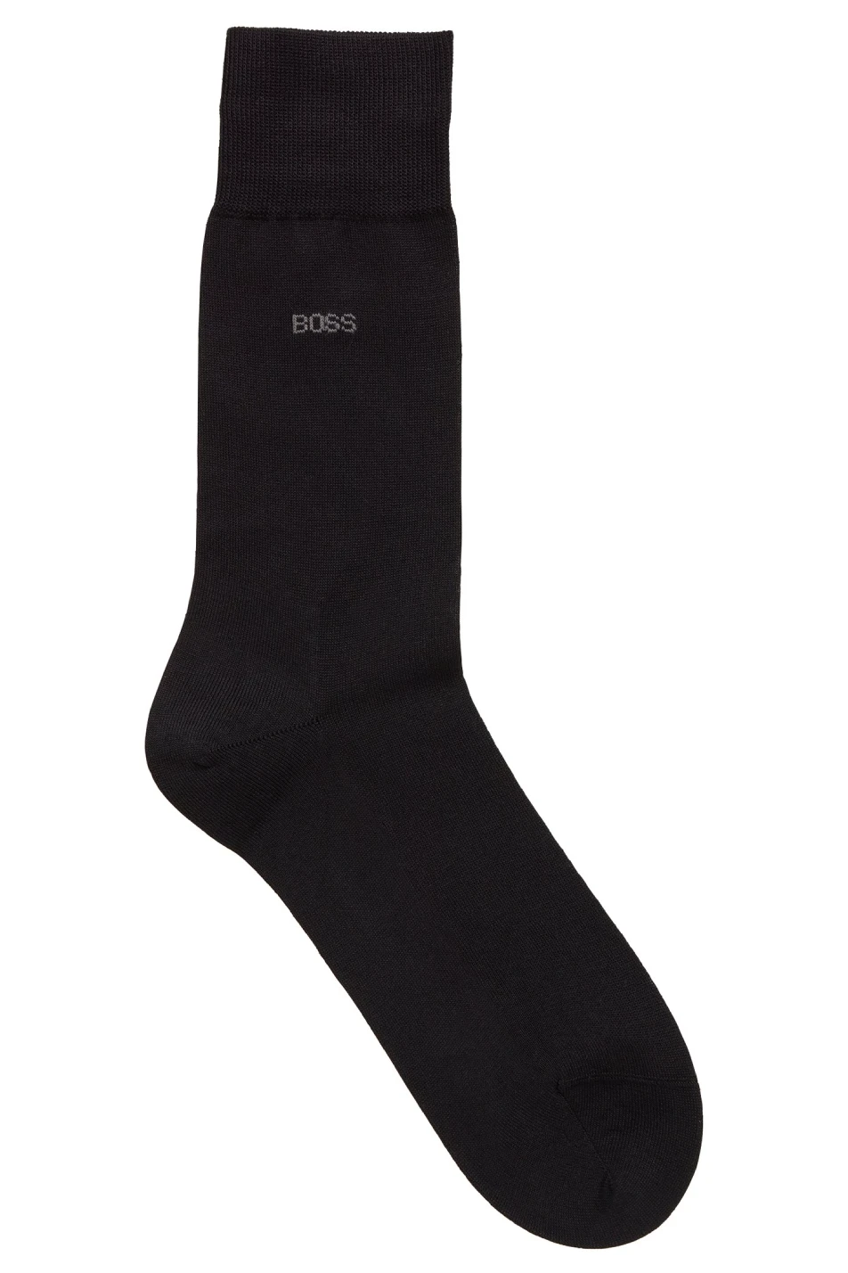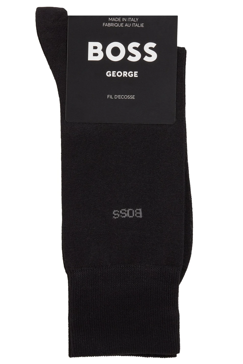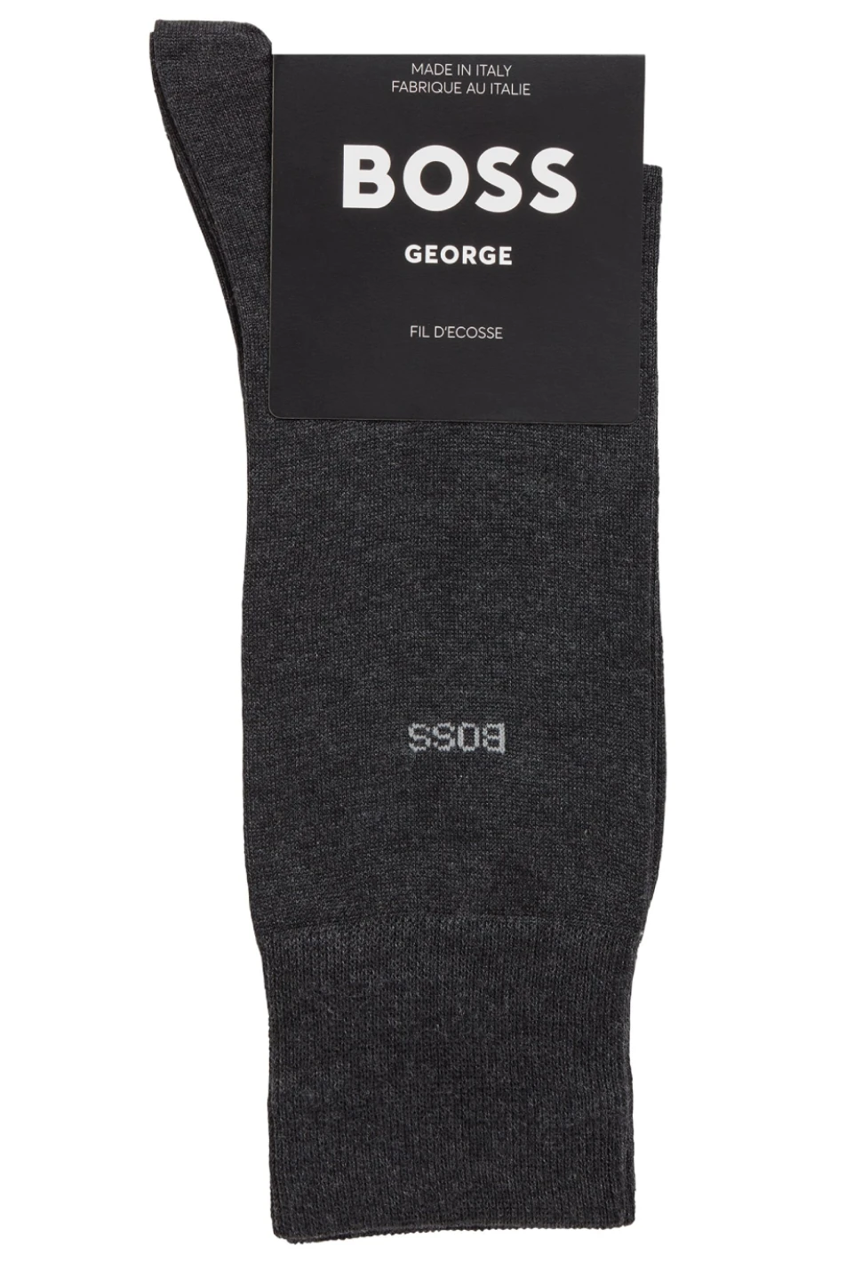 BOSS George Men’s Socks. Refined regular-length socks by BOSS with reinforced soles and stress zones. Detailed with subtle logos, these socks are crafted in Egyptian cotton with a mercerised finish for a lustrous appearance. Wear this impeccable foundation for business elegance.