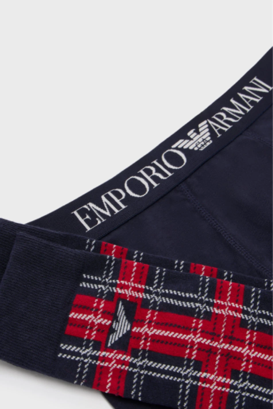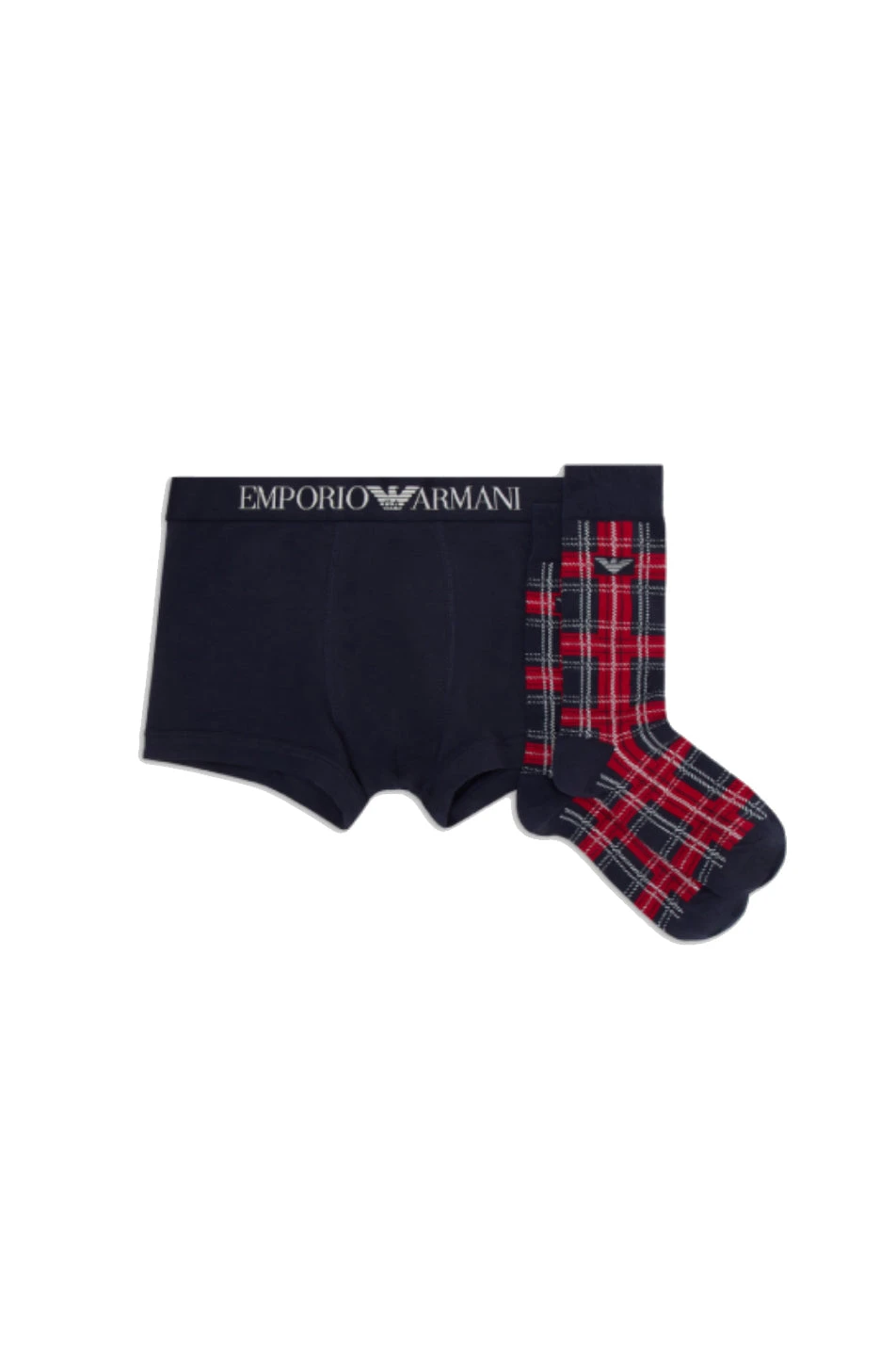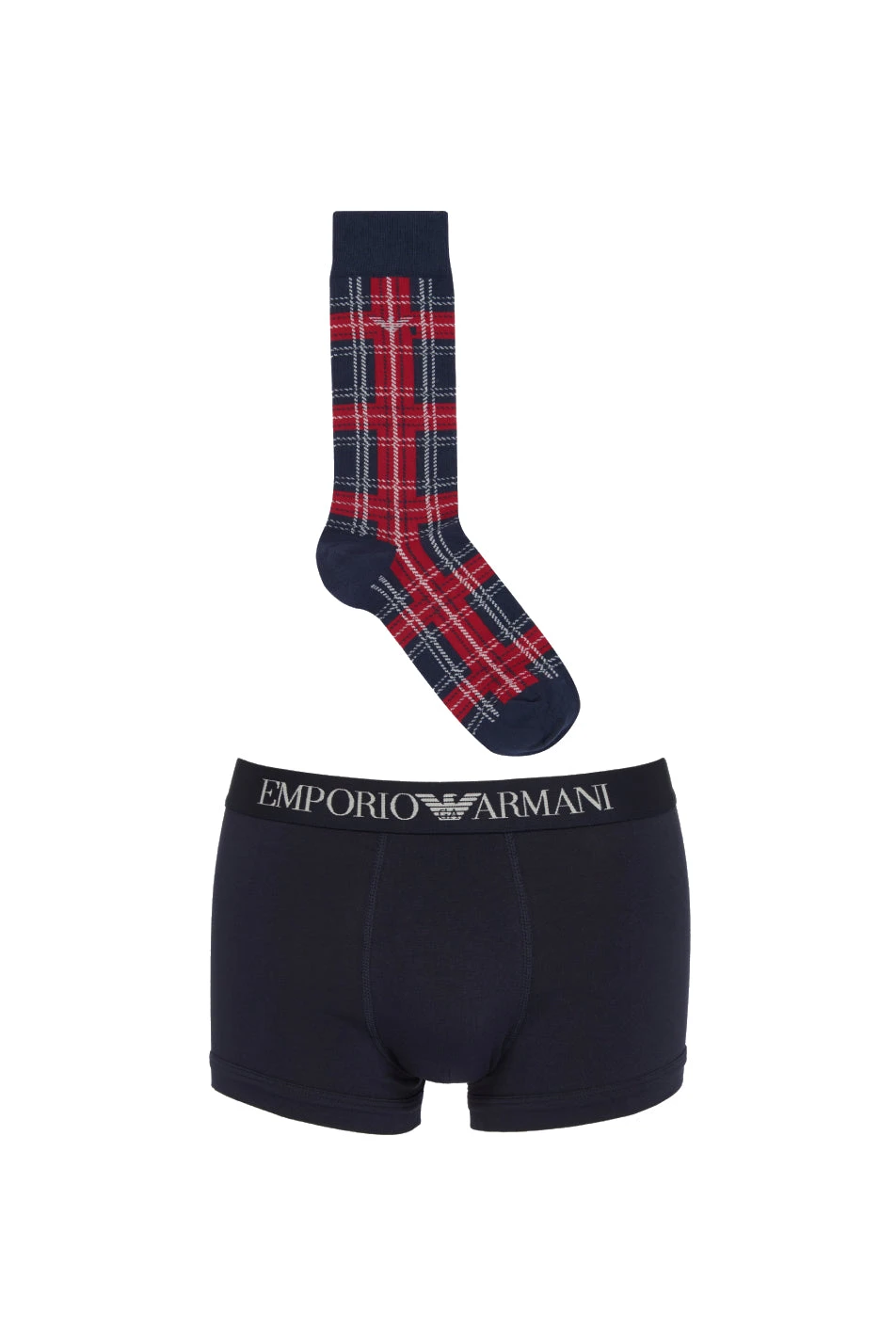 Emporio Armani Men’s Tartan Trunk Gift set. Fabulous gift-set includes one contoured trunk from Emporio Armani, featuring an elasticated logo waistband and crafted in cotton with a dash of stretch, and one pair of festive tartan dress socks.