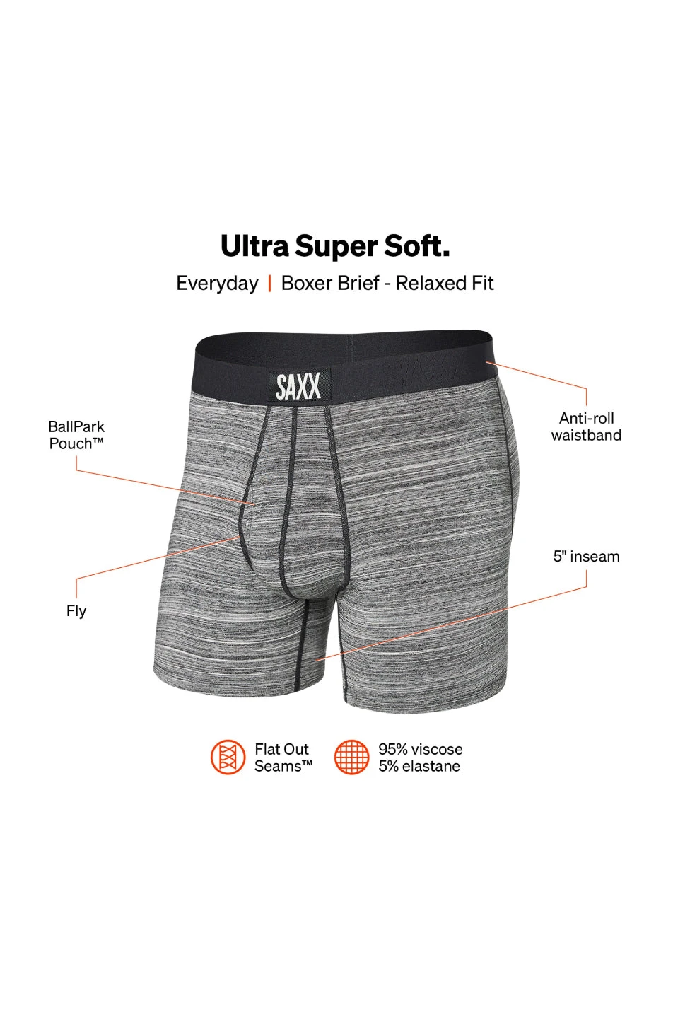 SAXX Men’s Ultra Soft Boxer Brief Fly. Elevating your everyday. Slightly looser than thee SAXX Slim Fit styles, Ultra combines super-softness with maximum breathability. Form-fitting through the butt and thighs, with extra ease at the leg opening.
